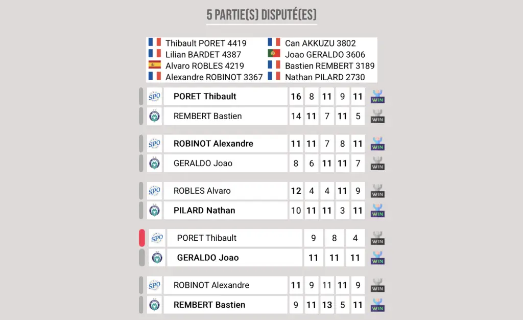 Après être passé tout près de la victoire, il était du devoir de notre N° 1 Thibault Poret de conclure cette rencontre en s’imposant face à Joao Geraldo. Malheureusement, Thibault paru emprunté et ne trouva à aucun moment les solutions pour inquiéter le leader d’Angers qui s’imposait en trois sets secs.