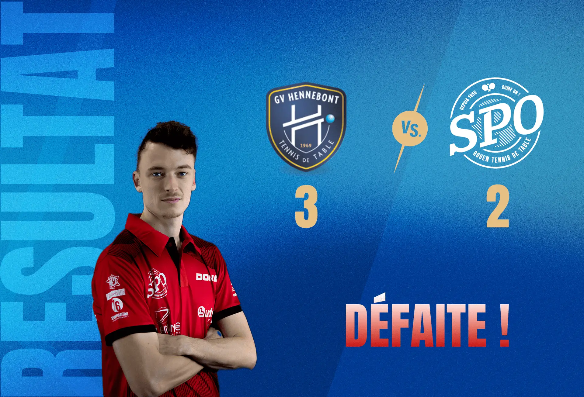 Pour la quatrième partie, retours d’Alex Robinot côté Rouennais et de Lev Katsman côté Hennebontais. Après un premier acte manqué, notre Coyote a su trouver quelques solutions pour gêner son adversaire, mais malheureusement il n’a pas su conclure les possibilités de recoller à 1-1. Globalement dominé par la vitesse et les placements de son adversaire, Alex a dû rendre les armes en s’inclinant en trois petits sets, malgré des échanges spectaculaires que seul le Ping peut nous offrir. Défaite 3-0.