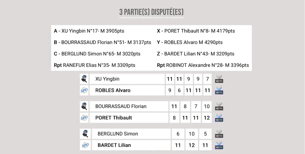La salle de Roanne réputée pour être un chaudron est montée en température sur les deux premiers sets de la première rencontre entre le joueur chinois Xu Yingbin opposé à Alvaro Robles. Notre coyote en devenant plus agressif au 3 ème set provoquait une baisse de quelques degrés du chaudron roannais. Le joueur local reprenait sa marche en avant dans le 4 ème set qu’il menait 8 à 4. Notre coach Stéphane Hucliez prenait alors un temps mort très opportun et Alvaro réalisa une incroyable remontada pour emporter le 4 ème set qui eut pour effet de climatiser la salle. Il continuât sur cette incroyable dynamique pour empocher le 5éme set qui clairement enrhuma le public local.