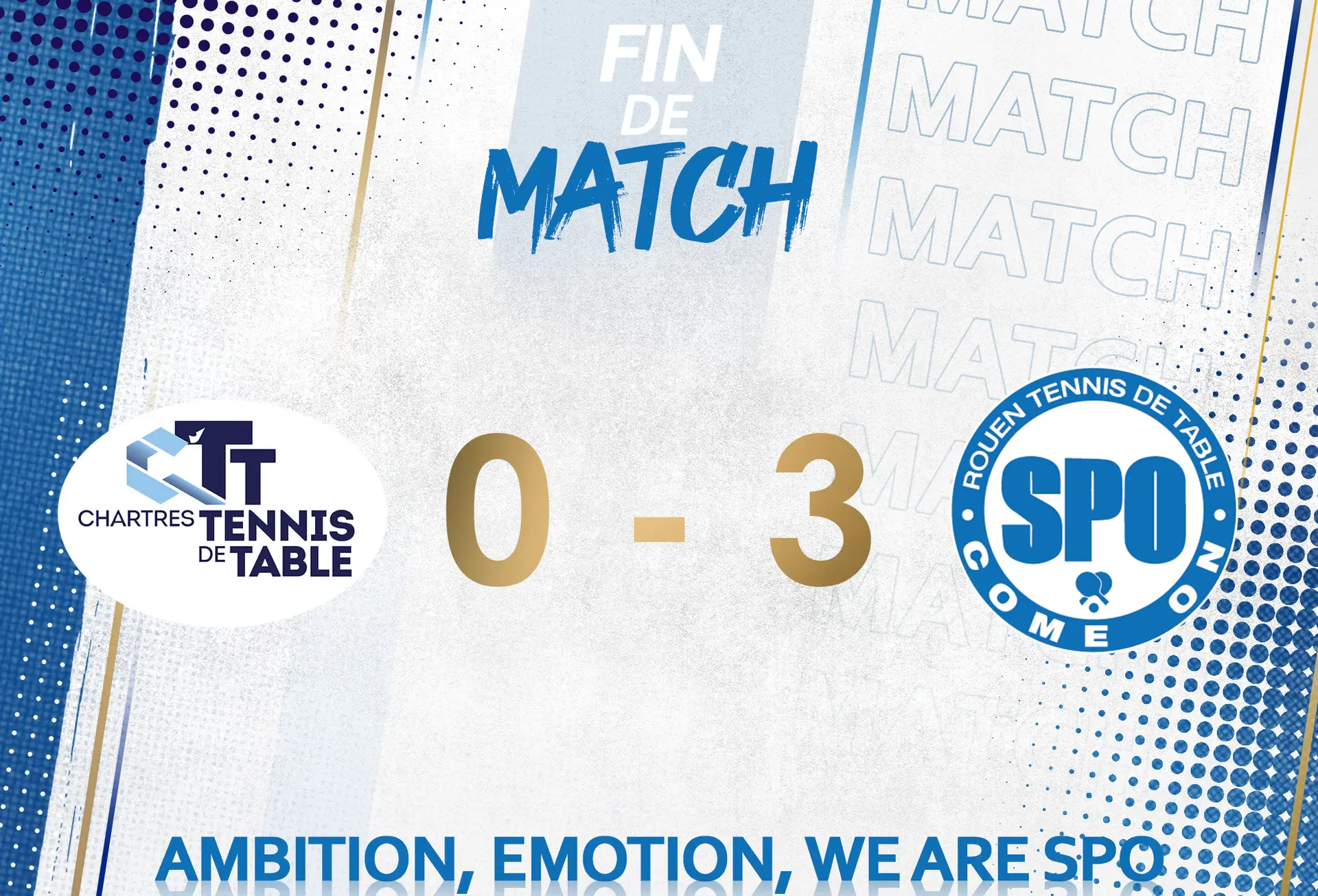 Victoire 3-0 en ne concédant aucune manche sur l’ensemble de la rencontre, avec des matchs à sens unique, en témoignent le différentiel de points marqués par les deux équipes (53 pour Chartres contre 104 pour Rouen), qui sont quasiment du simple au double.